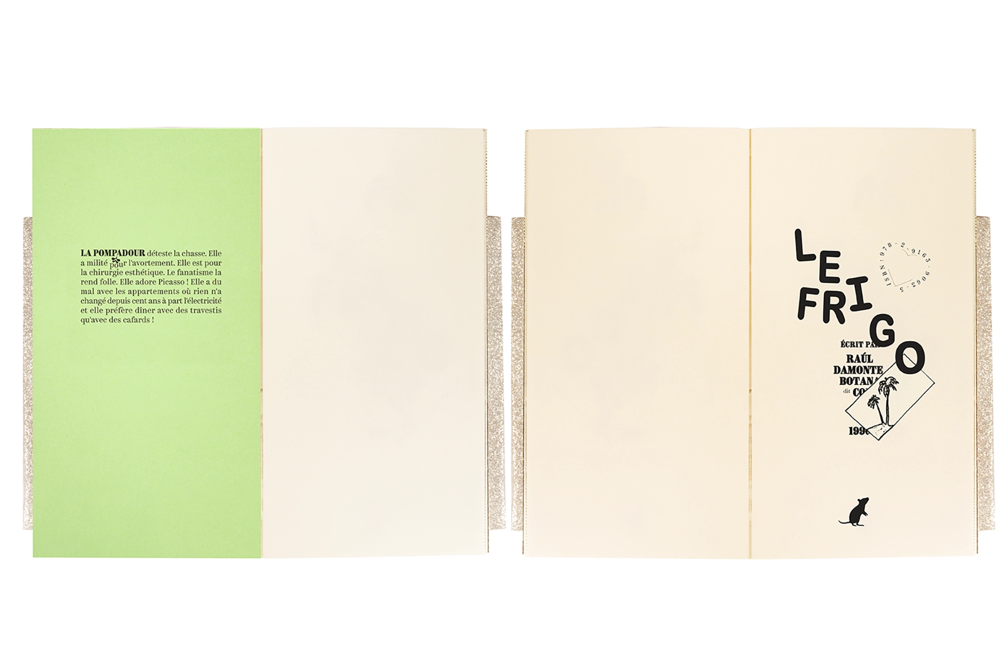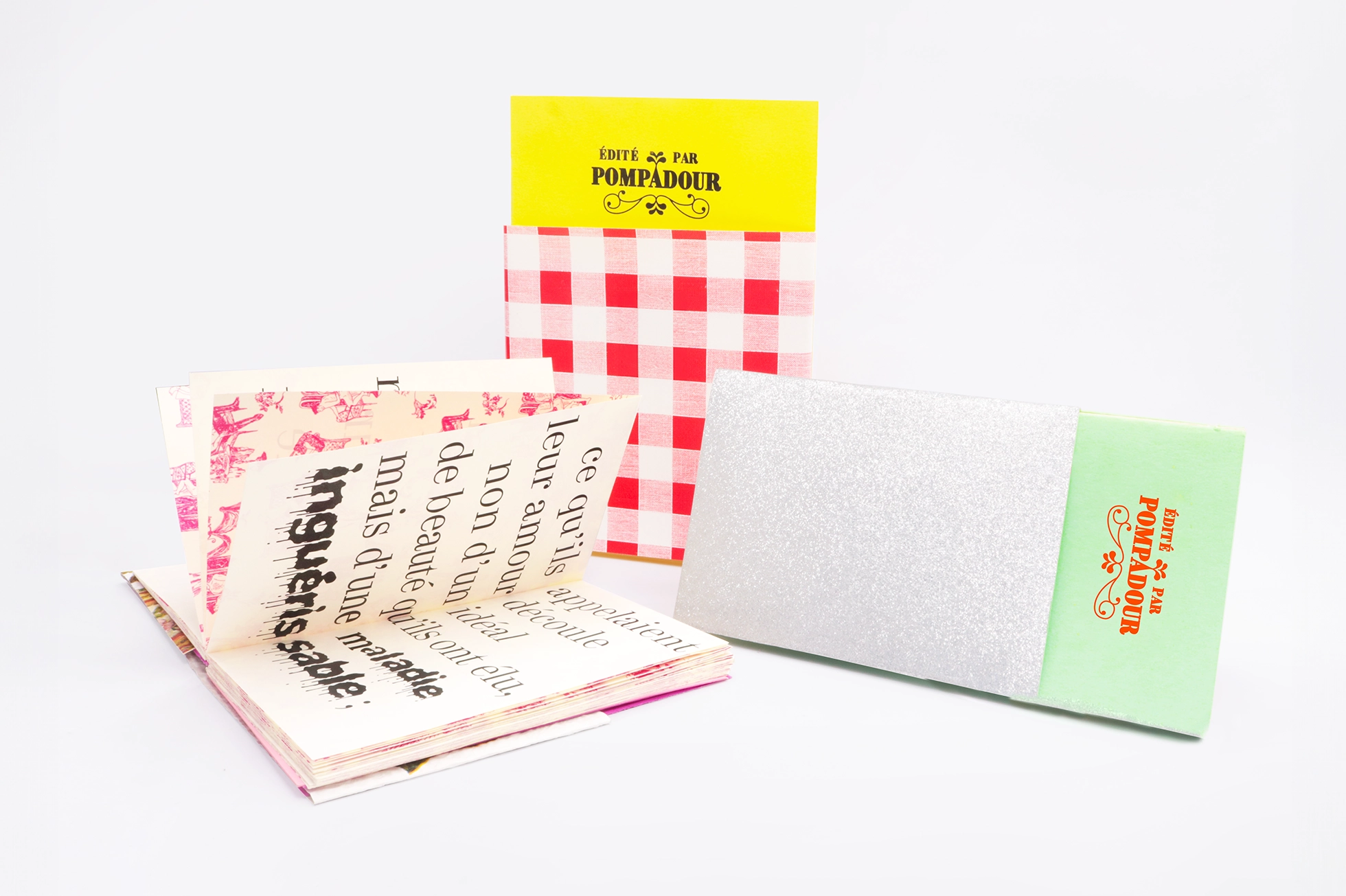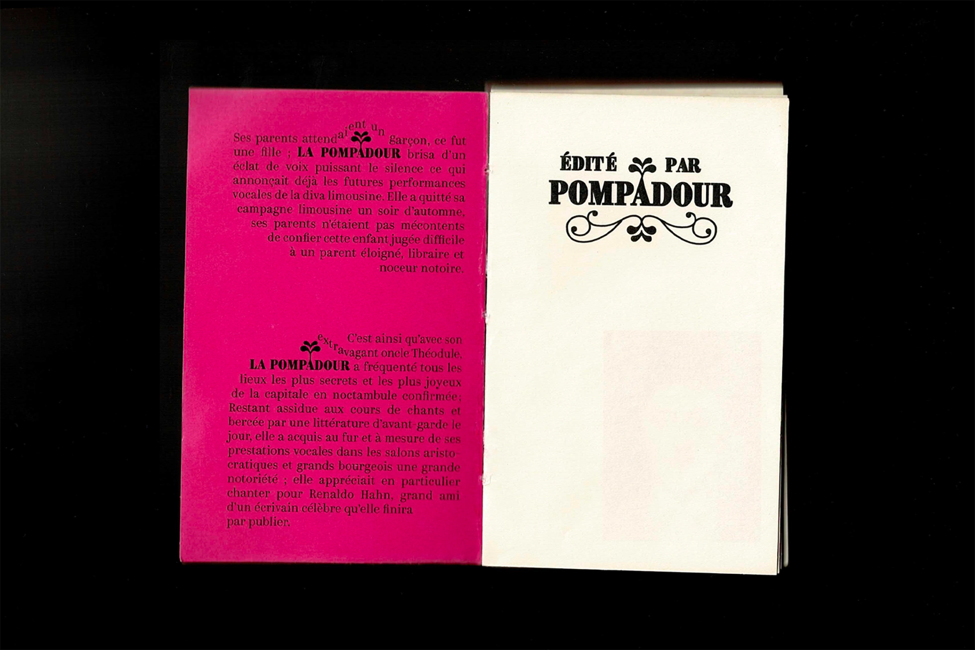La Pompadour est une maison d’édition qui cherche à répondre à la question : qu’est-ce qui constitue un texte queer ? Ce travail est une exploration de la notion de théâtralité : La Pompadour n’est pas seulement un nom de collection, c’est un personnage insaisissable qui utilise le livre pour se mettre en scène et se réinventer. Comme costume et décor du livre, la jaquette fait l’objet d’une attention particulière. Les artifices et éléments flamboyants s’y combinent pour évoquer tour à tour les fêtes costumées (faux cuir), les événements festifs (paillettes en plastique) ou les espaces domestiques (papiers peints, toiles cirées). Enfin, à l’intérieur de chaque ouvrage, la typographie et les illustrations mettent en valeur la théâtralité propre à chaque texte.