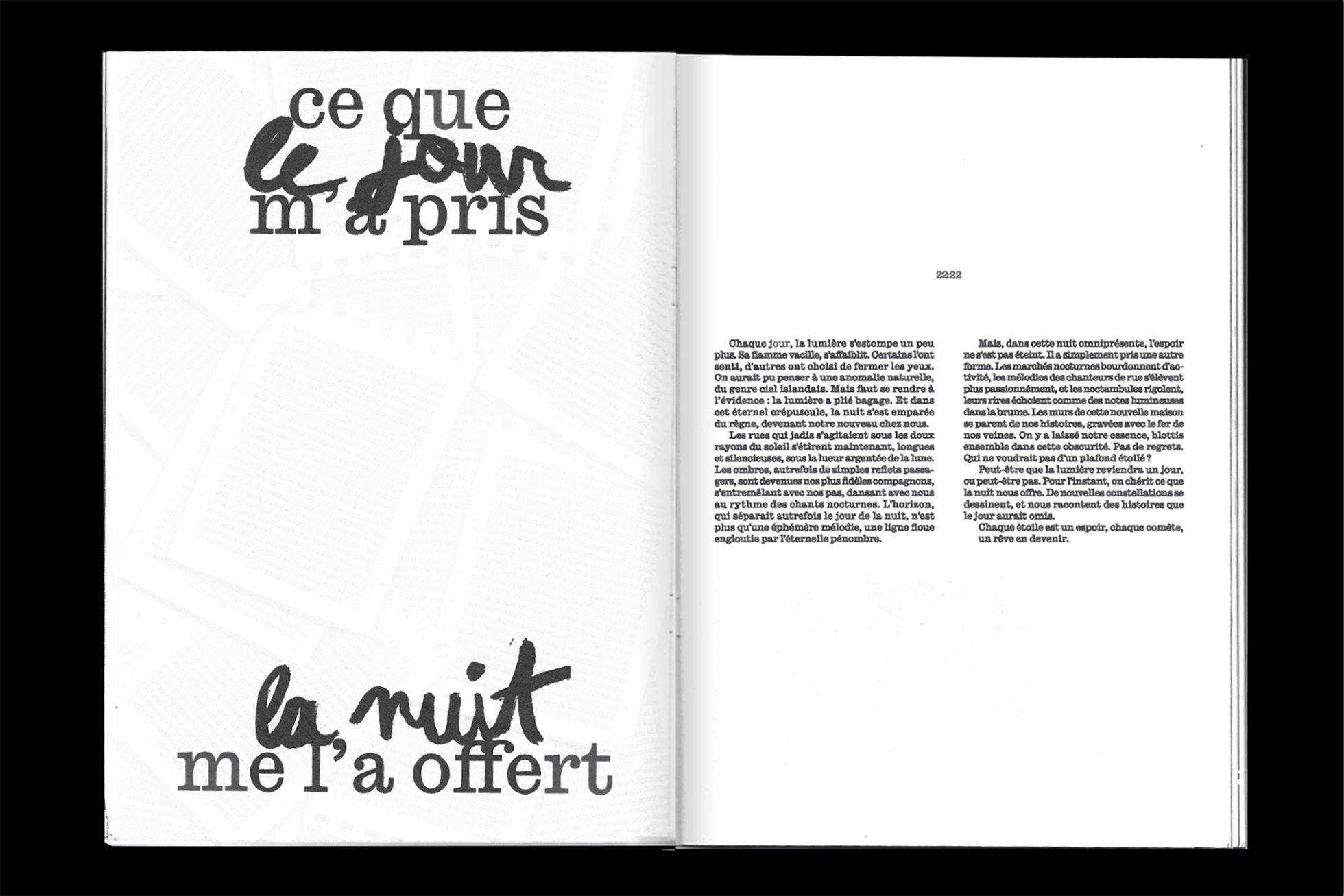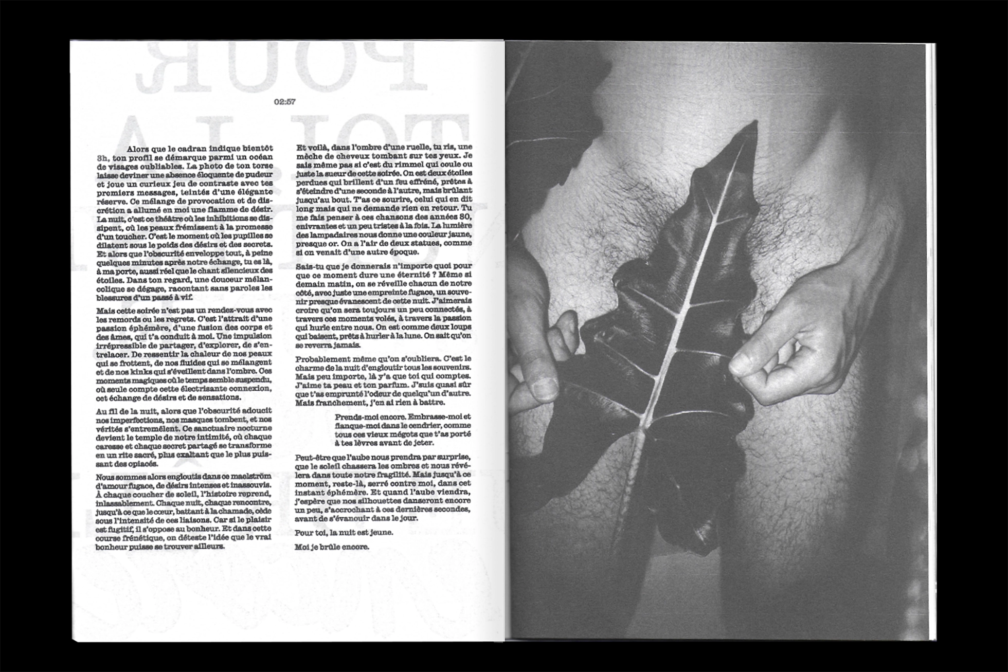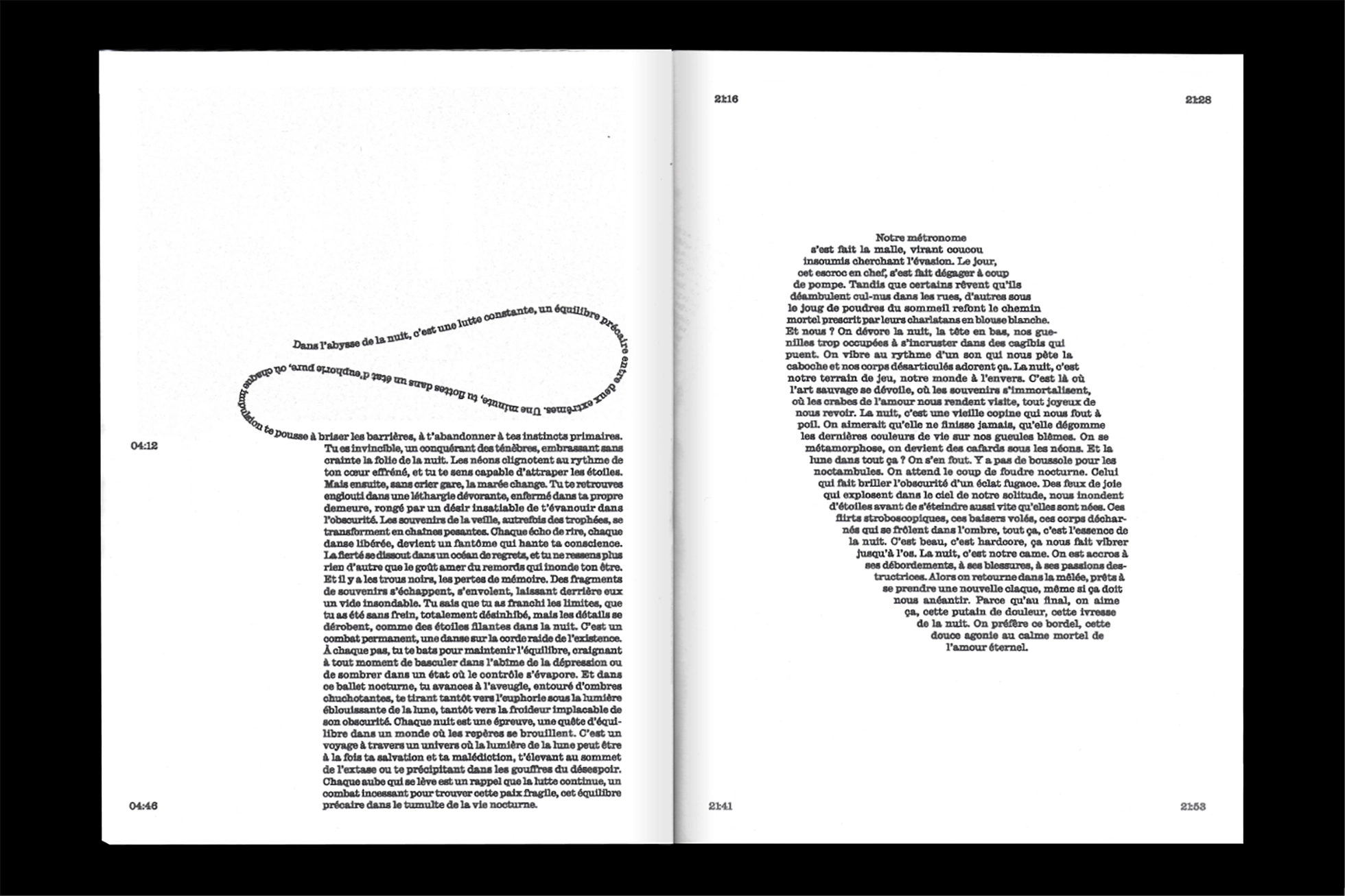 La Nuit Je Brûle est un projet en collaboration avec Benjamin Amis. Cette édition rassemble des textes en prose poétique, mettant en scène un jeune narrateur qui explore des thèmes liés aux difficultés de l’existence : solitude, excès, amitié, sexe… Chaque texte est mis en page de manière unique, reflétant les changements d’atmosphère, de compagnie ou d’état d’esprit. Au lieu d’une pagination traditionnelle, c’est le passage du temps qui guide le lecteur à travers le texte, symbolisé par l’heure indiquée sur chaque page.