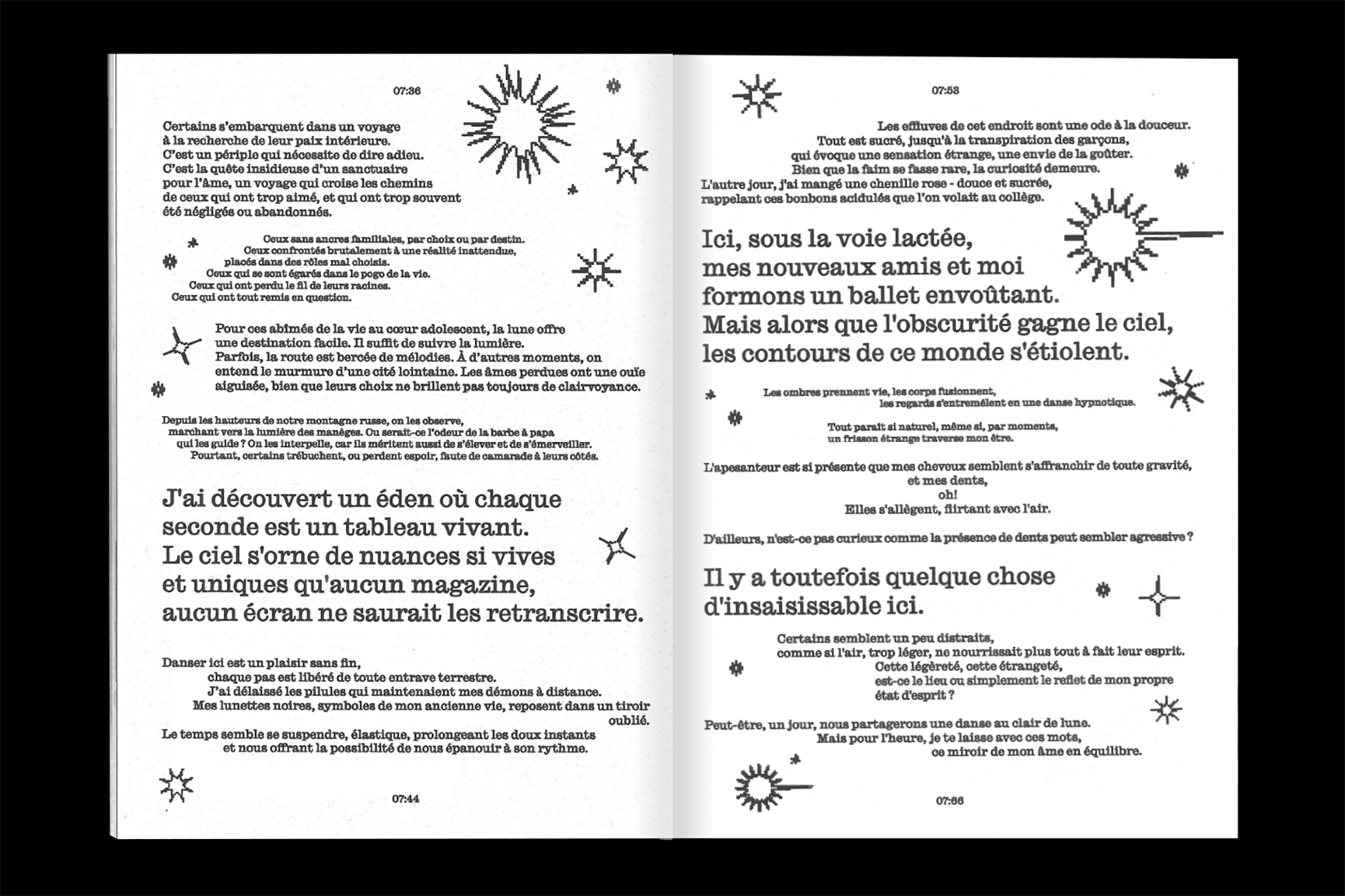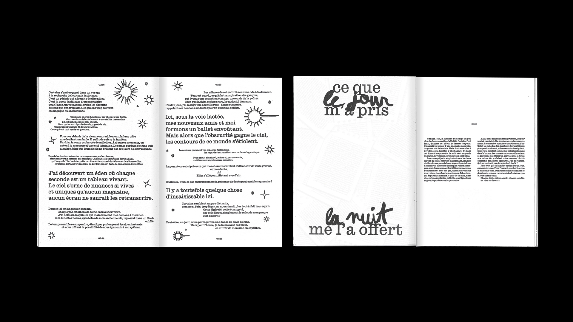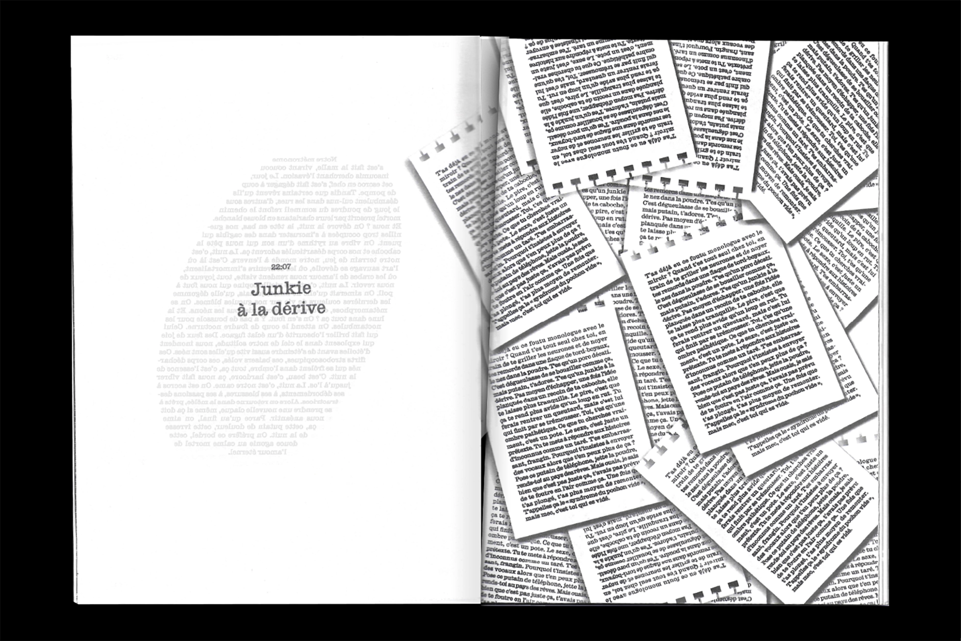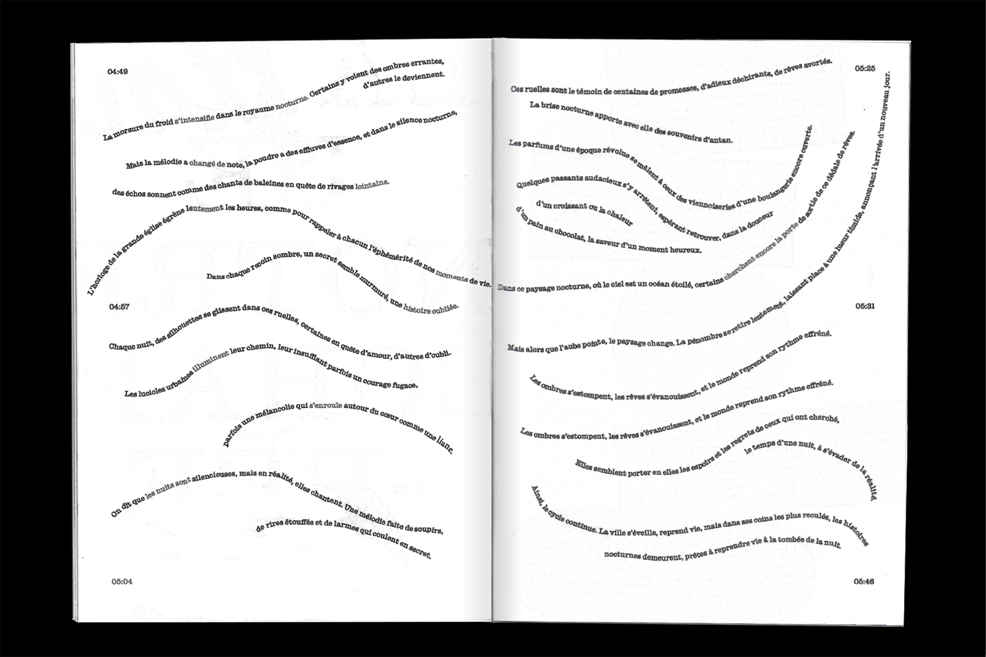 La Nuit Je Brûle est un projet en collaboration avec Benjamin Amis. Cette édition rassemble des textes en prose poétique, mettant en scène un jeune narrateur qui explore des thèmes liés aux difficultés de l’existence : solitude, excès, amitié, sexe… Chaque texte est mis en page de manière unique, reflétant les changements d’atmosphère, de compagnie ou d’état d’esprit. Au lieu d’une pagination traditionnelle, c’est le passage du temps qui guide le lecteur à travers le texte, symbolisé par l’heure indiquée sur chaque page.